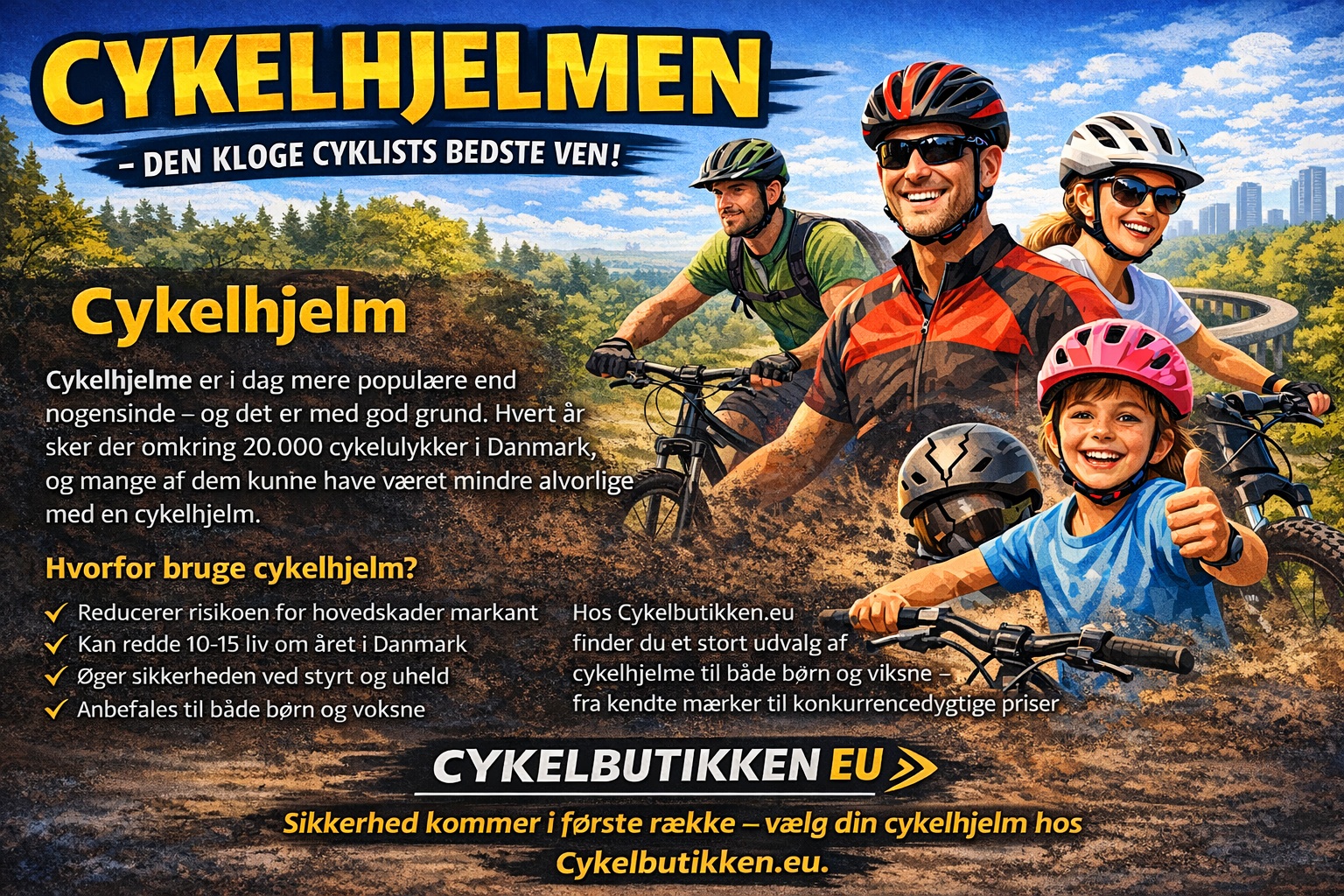 Hvert år sker der omkring 20.000 cykelulykker i Danmark. En cykelhjelm kan reducere risikoen for alvorlige hovedskader betydeligt – og i sidste ende redde liv.